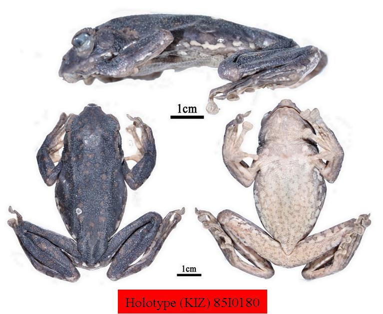 鉴别特征:第一二指间、第二三指间和第三四指间分别具基蹼、1/3蹼和1/2蹼;趾间具近全蹼,第四趾蹼达远端关节下瘤;趾吸盘小于指吸盘;掌、蹠腹面不呈肉红色。
