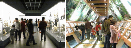 让观众流连忘返的是二楼正在展出的“鱼翔浅底——云南鱼类专题展”。在这里,首先印入观众眼帘的是展厅中央各式各样色彩斑斓的鱼儿们:他们时而闭目养神,时而嬉戏打闹,向观众淋漓尽致地展现着自己的生存智慧;旁边专题展板上深入浅出地叙述着鱼类的基本知识,如鱼类的演变、鱼类的行为与生存;云南的鱼类与研究以及鱼类文化;展板下方还陈列着部分动物所保存多年的珍贵的鱼类标本。专题展简明扼要地介绍了生活在高原水域的鱼类概况,并集中展示昆明动物所近五十年来在鱼类研究领域取得的科研成果和最新进展。观众根据自己的兴趣爱好,亲身体会,感受海洋世界的神奇美好和昆明动物所的辉煌成就。