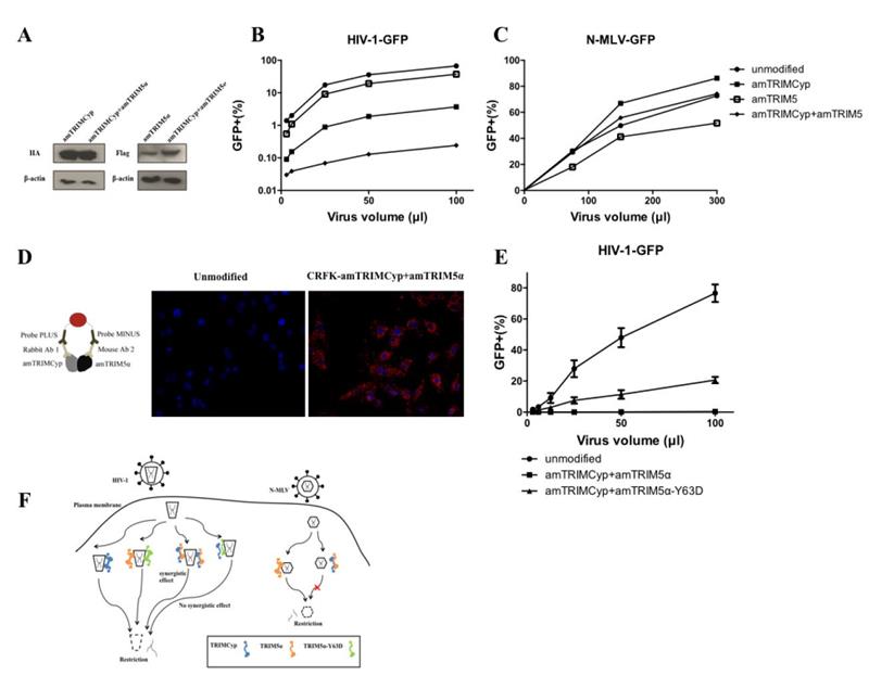 图 1. 熊猴TRIMCyp和TRIM5α对逆转录病毒的限制能力。(A-C) 熊猴TRIMCyp和TRIM5α协同限制HIV-1而丧失限制N-MLV的能力; (D)熊猴TRIMCyp和TRIM5α相互结合;(E) 与熊猴TRIMCyp结合能力弱的TRIM5α突变体不能提供强协同限制HIV-1作用;(F)熊猴TRIMCyp和TRIM5α协同限制HIV-1作用模式图。