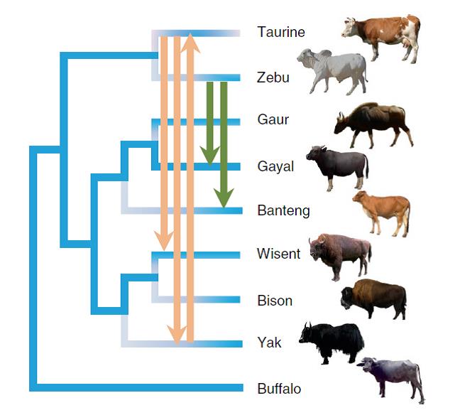 家养动物被人类成功驯化后,伴随着人类迁徙至世界各地。在这个过程中,家养动物会与当地各种野生近缘种相遇,从而发生杂交促使基因交流的发生。昆明动物研究所张亚平研究员、吴东东研究员课题组近期利用大规模基因组数据,阐明了基因交流在牛属动物的驯化以及环境适应中的重要作用,相关工作发表于Nature Ecology & Evolution, https://www.nature.com/articles/s41559-018-0562-y。