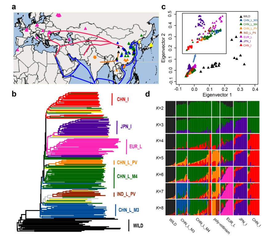 古代“丝绸之路”,是以蚕丝贸易为载体和符号,联系中西方经济及文化交流的交通要道。在丝绸之路的经济和文化传播过程中,蚕丝的生产者——家蚕,随之传播到亚欧各地,并经历近代育种后,形成现今丰富的地方与改良品种。然而,到目前为止,人们对丝绸之路的了解仍主要局限于文化、史料等层面,缺乏更深入的证据。另一方面,作为唯一完全驯化的昆虫,其驯化历史及其重要性状的人工选择机制的揭示,将对全面理解人工选择机制这一自达尔文以来长期悬而未决的重大科学问题,提供独特的证据和线索。该研究从中国、欧洲、日本和印度收集了137种不同品种的家蚕进行分析,确定家蚕是在5000年前从中国野桑蚕祖先单一驯化而来,驯化后三眠品系是最先分化的一个组,然后家蚕在连接中国、南亚和欧洲的古丝绸之路沿路上曾出现过几次扩散,并随后在中国和日本形成了特有的优良品种。