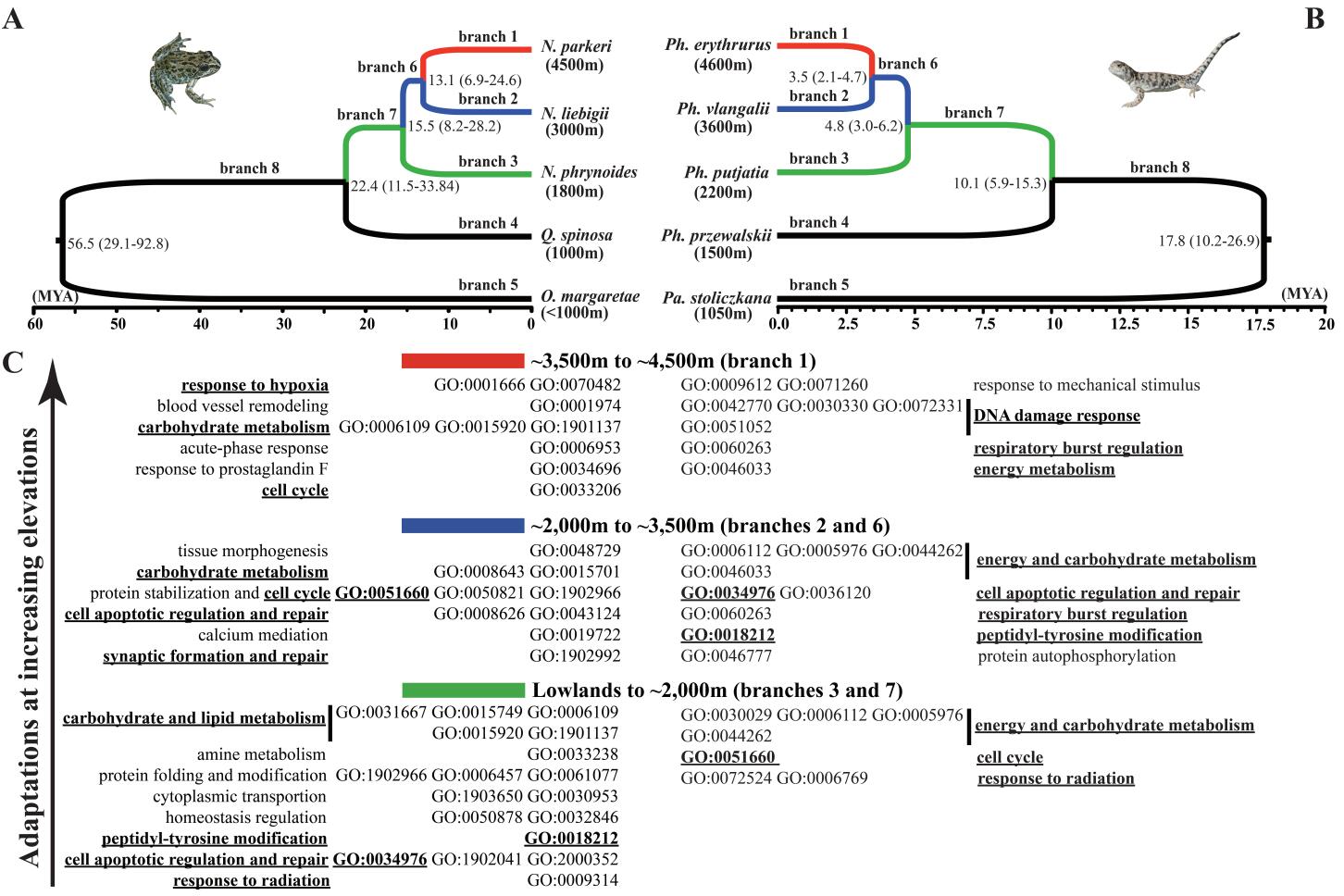 图1. 倭蛙属(左)和沙蜥属(右)的系统发育关系及各物种海拔分布,以及倭蛙属(左)和沙蜥属(右)发生低氧适应相关的功能举例(下划线标记为二者存在趋同)。
