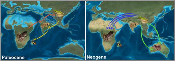此外,研究结果并未发现马达加斯加与南极-澳大利亚-新几内亚板块之间存在着生物交流,澳大利亚现生的蛙超科物种是在晚第三纪两次独立地从亚洲扩散进入澳洲的。本研究还揭示了蛙超科祖先物种到达亚洲后,分别有三次独立地从亚洲扩散至非洲的迁移事件,均发生在北非主要沙漠形成之前。