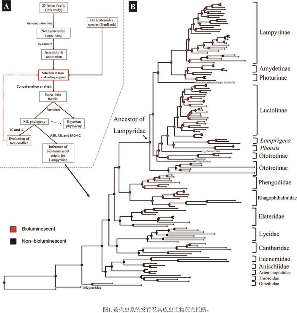 生物荧光是进化生物学最有趣的现象之一,主要用于警戒和求偶交流。因此,具有生物荧光的类群自达尔文时期就吸引着众多的生物学家,是探索新特征起源的理想研究系统之一。萤火虫是最著名的陆生发光生物,广布于世界各地,分为9个亚科、约100个属2000多个种,已发现的所有类群至少在幼虫阶段都可发光。萤火虫的一些属的有限地理分布和种群稀有性使得萤火虫的分子系统发育关系仍诸多不确定性,这种系统发育的不确定性在很大程度上限制了对生物荧光起源与进化这一有趣现象的探讨。