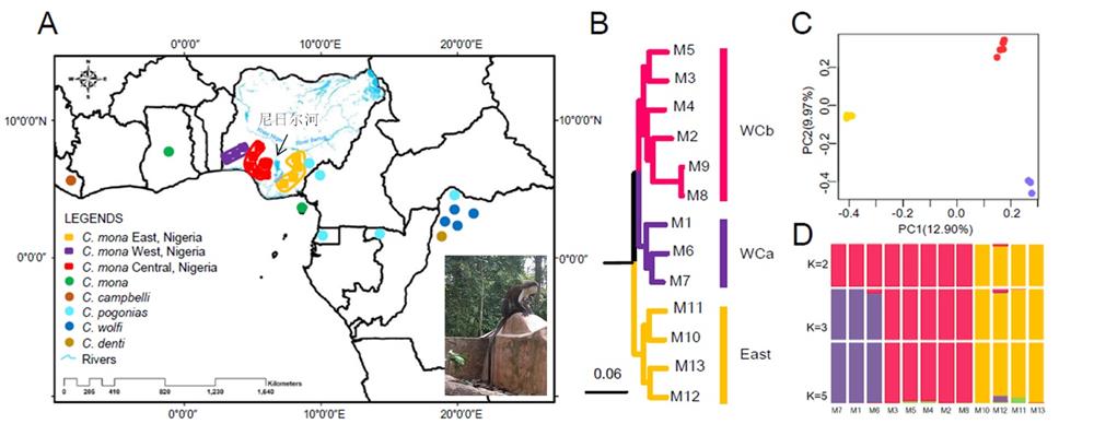 该研究以“Population Genomics Reveals Incipient Speciation, Introgression, and Adaptation in the African Mona Monkey (Cercopithecus mona)”为题,在线发表于进化生物学领域知名期刊《Molecular Biology and Evolution》(文章链接:https://academic.oup.com/mbe/advance-article/doi/10.1093/molbev/msaa248/5912538)。课题组尼日利亚籍留学生Adeola Oluwakemi Ayoola和助理研究员张宝林为文章的共同第一作者,吴东东研究员和张宝林助理研究员为文章的共同通讯作者。该研究得到国家自然科学基金,中科院中非中心,中科院野生动物资源库和中科院青年创新促进会的资助。该项研究工作依托昆明动物研究所承担建设的“模式动物表型与遗传研究(灵长类)国家重大科技基础设施”开展。