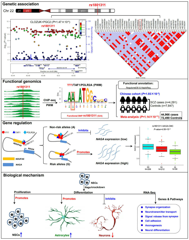 为了进一步阐明rs1801311在精神分裂症中的作用和机制,罗雄剑课题组对rs1801311的调控机制进行了系统的研究。系列功能实验(包括报告基因实验、转录因子敲低,ChIP-qPCR、CRISPR-Cas9介导的基因组编辑等)表明rs1801311是一个具有调控功能的风险变异。表达数量性状基因座(eQTL)分析表明rs1801311在人类大脑中与NAGA表达的相关性最显著。有趣的是,染色质长程相互作用数据表明rs1801311与NAGA有染色质相互作用,提示rs1801311可能通过长程调控NAGA表达介导精神分裂症风险。进一步的研究发现rs1801311的风险等位基因(G)通过减少YY1结合影响NAGA表达。