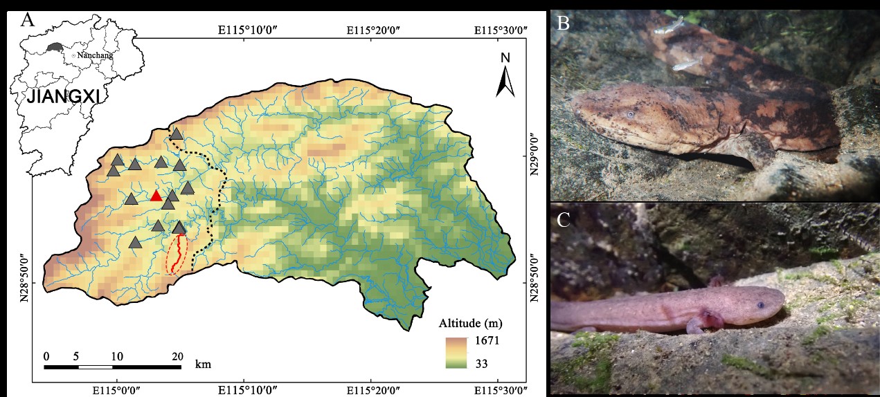 该研究以“Discovery of a wild, genetically pure Chinese giant salamander creates new conservation opportunities”为题,5月18日发表于Zoological Research。(https://www.zoores.ac.cn/en/article/doi/10.24272/j.issn.2095-8137.2022.101)。电子游戏app下载安装柴静副研究员、博士研究生卢宸祺、易木荣为论文共同第一作者,车静研究员、张亚平院士和Robert Murphy教授为本文共同通讯作者。本研究由电子游戏app下载安装车静团队牵头,江西省科学院生物资源研究所戴年华团队及江西九岭山国家级自然保护区管理局合作开展,其他参加单位包括中国科学院水生生物研究所、江西靖安县农业农村局等。