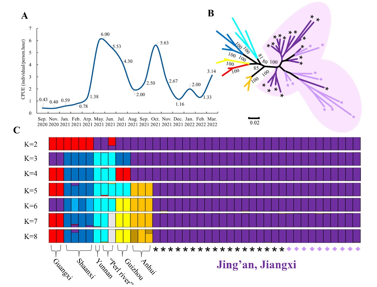 注:A:单位每人每小时大鲵目击数量(CPUE)变化图,自2020年9月至2022年3月,每人每小时目击大鲵成体和亚成体个体数量变化;B:基于简化基因组SNPs位点构建的最大似然树,淡紫色背景代表U2进化支(江西大鲵);C:基于简化基因组SNPs位点遗传组分混合分析 (K=2-8, 最适 K=7)。星号(*)表示来自大杞山的18个野外个体,包括成体,亚成体以及幼体;淡紫色菱形(◇)表示来源养殖场的个体。