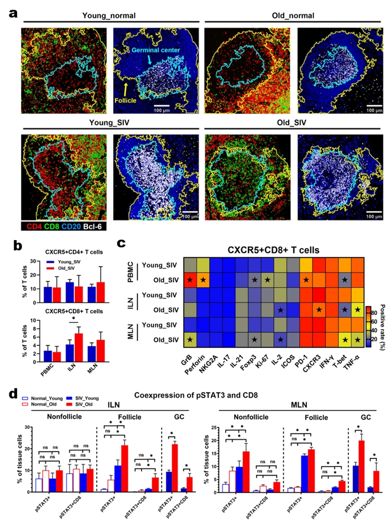 图:SIV慢性感染老年中国猕猴的滤泡CD8+ T细胞大量浸润并伴随颗粒酶B高表达和STAT3高度活化。(a)四色免疫荧光展示淋巴结滤泡和生发中心内CD4和CD8细胞的分布特征,SIV慢性感染老年猕猴呈现大量CD8细胞浸润;(b)流式细胞术检测显示SIV感染老年猕猴淋巴结组织有更高的CXCR5+CD8+ T细胞比例;(c)流式细胞术检测显示SIV感染老年猕猴的CXCR5+CD8+ T细胞高表达颗粒酶B;(d)IHC-FACS组织原位分析技术显示SIV感染老年猕猴的滤泡和生发中心有更高比例的pSTAT3+CD8+细胞。
