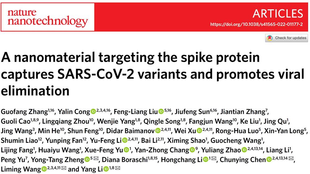 8月22日,中国科学院深圳先进技术研究院联合国家纳米科学中心、中国科学院高能物理研究所和电子游戏app下载安装的合作成果,新型广谱抗新冠纳米材料,以“A nanomaterial targeting the spike protein captures SARS-CoV-2 variants and promotes viral elimination”的题目,发表于纳米领域国际顶级期刊《自然—纳米技术》。