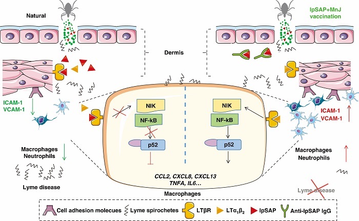 电子游戏app下载安装赖仞课题组聚焦于有毒动物和动物毒素、致力于动物生存策略及环境适应的物质基础与分子机制研究,在有毒病原媒介生物利用毒素介导病原体-宿主互作机制方面做了系列探索。如埃及伊蚊唾液腺毒素协助病原体传播机制 (Nature Immunology. 2018;19:342-353)、蝙蝠唾液腺毒素促进病毒传播(PNAS. 2022;119:e2110647119)等。此次,赖仞课题组牵头与北京微生物与流行病学研究所曹务春团队、美国南密西西比大学Shahid Karim团队合作,发现全沟硬蜱(Ixodes persulcatus)唾液中存在靶向LTβR受体的15 kDa的毒素IpSAP(I. persulcatus salivary protein)。IpSAP通过抑制LTβR受体和下游信号转导,在小鼠莱姆病螺旋体感染部位形成早期局部免疫抑制,促进伽氏疏螺旋体(B. garinii)的传播。进一步研究发现IpSAP重组蛋白与MnJ佐剂联用免疫小鼠可有效降低全沟硬蜱叮咬传播莱姆病螺旋体的效率,同时对肩突硬蜱(I. scapularis)和卵形硬蜱(I. ovatus)的唾液腺提取物模拟的莱姆病螺旋体传播具有显著保护作用。本研究加深了人们对蜱传莱姆病分子机制的认识,阐明了淋巴毒素受体(LTβR)是宿主抵抗莱姆病螺旋体感染的关键分子,而且拓展了从蜱唾液免疫抑制毒素的角度开发阻断媒介传播途径的广谱莱姆病疫苗的思路。