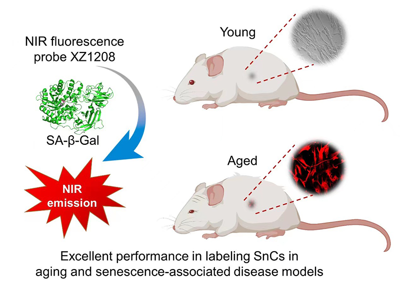 (年轻细胞的β-半乳糖苷酶(β-Gal)表达和活性较低,而衰老细胞则会高表达且呈现出较高活性的β-Gal(被称作SA-β-Gal)。XZ1208自身不产生荧光,但在SA-β-Gal的识别和剪切下能释放出近红外荧光染料,从而实现对衰老细胞的特异标记。在自然衰老、照射诱导和早衰症小鼠、纤维化及创伤-愈合等体内模型中,低剂量的XZ1208即可实现对衰老细胞的长效示踪。)