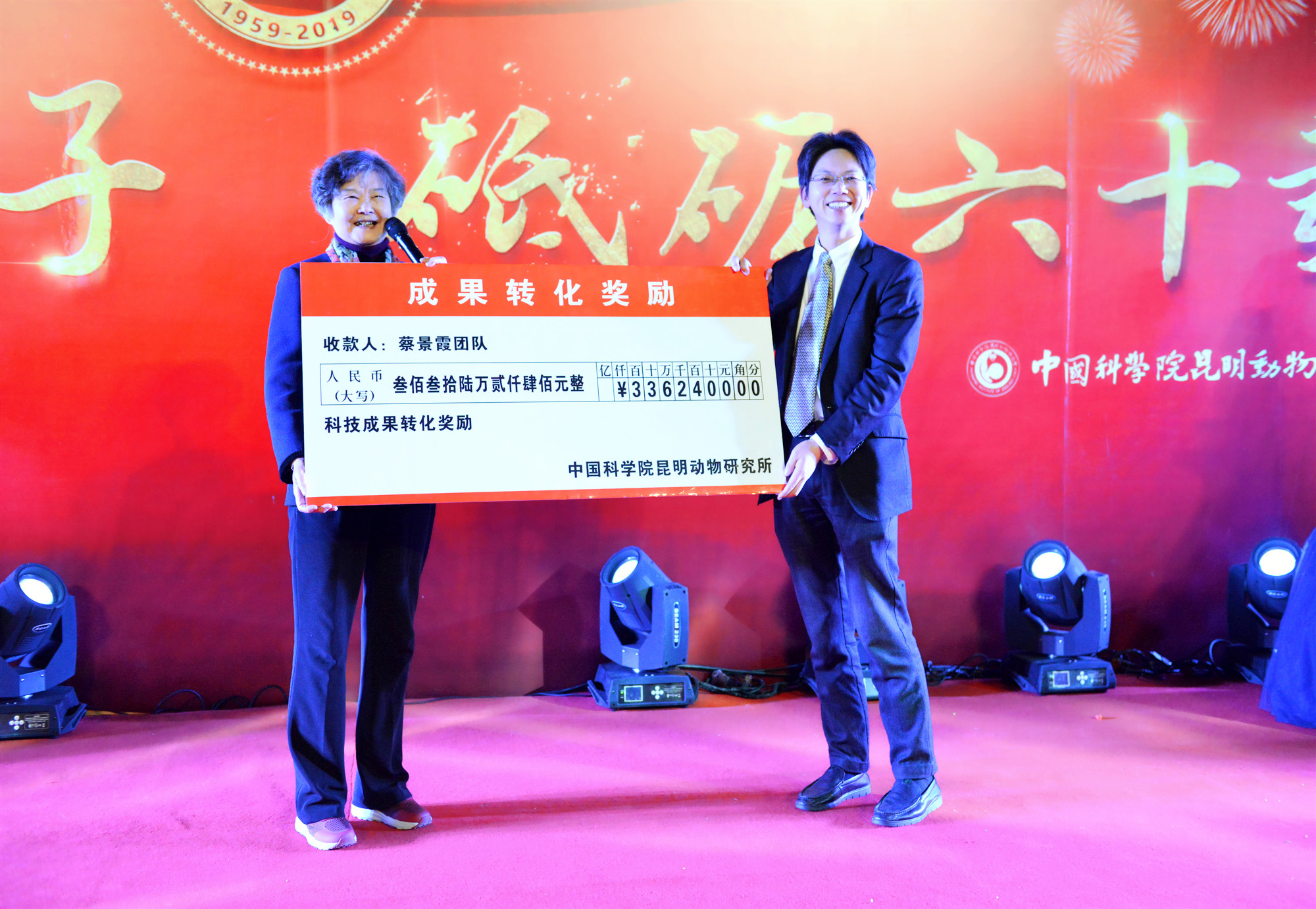 随后,昆明动物所所长姚永刚为在2018年研究所成果转移转化工作中作出突出贡献的蔡景霞团队颁发奖励,并号召全所科研人员向老一辈科学家学习,不忘初心、牢记使命,为实现“四个率先”、建设创新型国家和世界科技强国不断作出新的更大贡献。