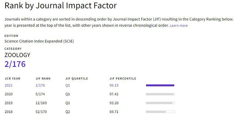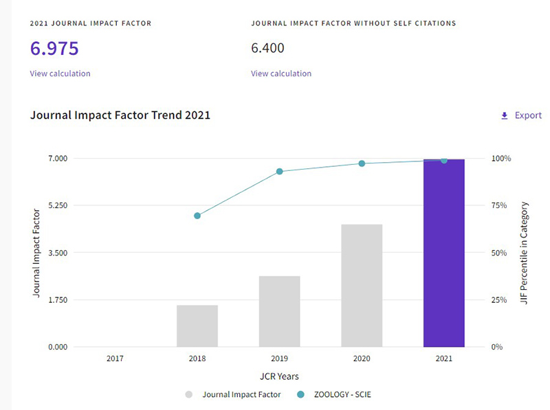 Zoological Research(《动物学研究》(英文版),ZR)创刊于1980 年,是电子游戏app下载安装和中国动物学会共同主办的国内外公开发行的动物学类学报级双月刊。以报道国内外动物学主要研究领域的最新成果、新进展、新技术和新方法为己任,为促进现代动物科学的发展,促进学术交流,为创新型国家的需求和经济建设服务。ZR主要发表以下三方面研究结果:1)灵长类动物与动物模型;2)动物资源保护与利用;3)动物多样性与进化。2021年度,ZR影响因子提升至6.975,继续保持良好增长态势,排名全球动物学学科176种SCI期刊的第2名。